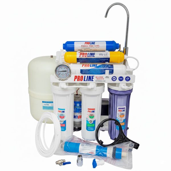 دستگاه تصفیه آب شش مرحله ای خانگی پرولاین با سیستم اسمز معکوس RO (ساخت کشور تایوان) در طی 7 مرحله توسط 7 فیلتر آب را تصفیه میکند.
